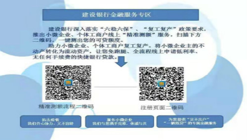 建設(shè)銀行金融服務(wù)專區(qū)2021-03-17建設(shè)銀行深入落實“六穩(wěn)六保”、“復(fù)產(chǎn)復(fù)工”政策要求,推出小微企業(yè)、個體工商戶線上“精準(zhǔn)測額”服務(wù),掃描下方二維碼,一鍵測出您的可貸額度。珠粒小微企業(yè),個體工商戶復(fù)工復(fù)產(chǎn)。將小微企業(yè)主得不動產(chǎn)轉(zhuǎn)化為流動資產(chǎn),讓您免跑腿、全流程線上申請低利率、無任何手續(xù)費得快捷銀行貸款。